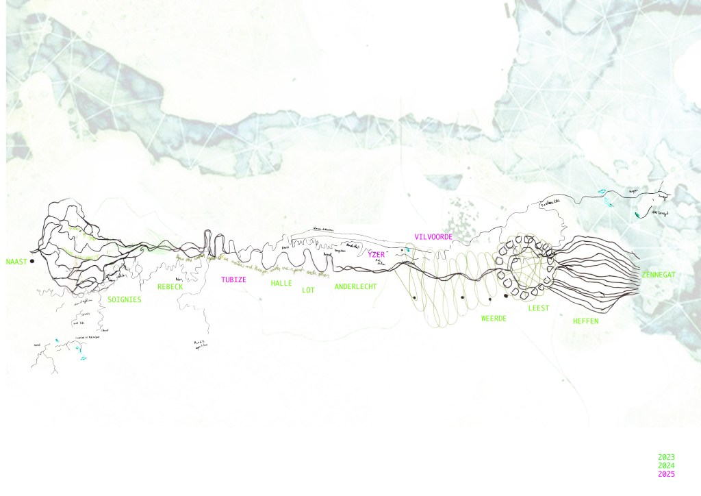 STILL HERE – An alliance of care for the SZenne river between 2023-26 in Belgium. This long-term commitment is a systemic relationship with the river’s ecosystem and local communities to weave an alliance of care for the SZenne as a potential declaration for the recognition of its rights. The process takes place across Wallonia, Brussels and Flanders – from the source of the SZenne in Soignies to its confluence at the Zennegat in Mechelen.